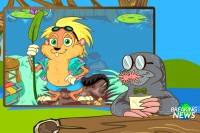 Animazia news anchor Howard Molehill's interview with Jerry Muskrat, the resolute rodent who has resourcefully rendered a raft and will row the river route to reach his relatives.